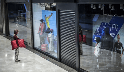 베개를 들고 쇼핑몰을 구경하고 있는 여인